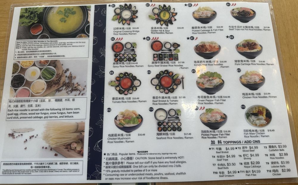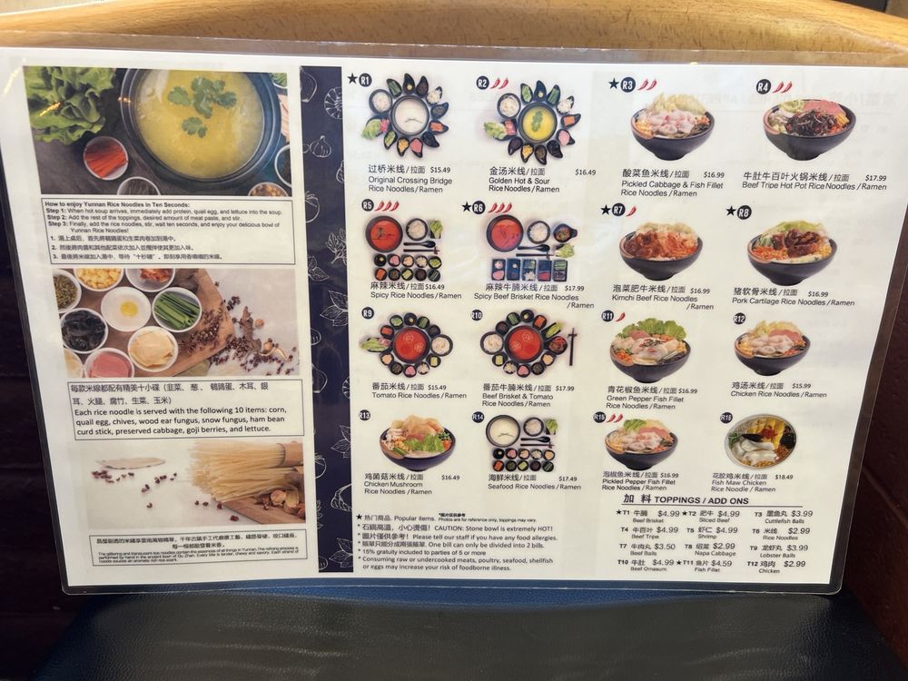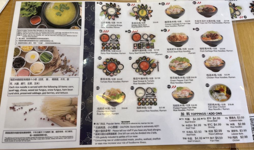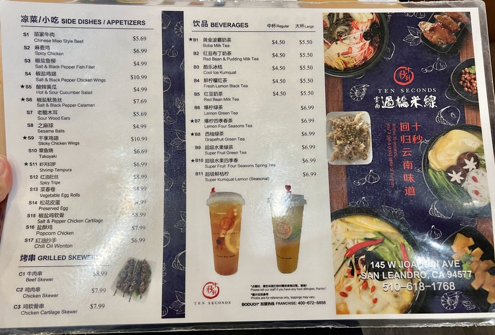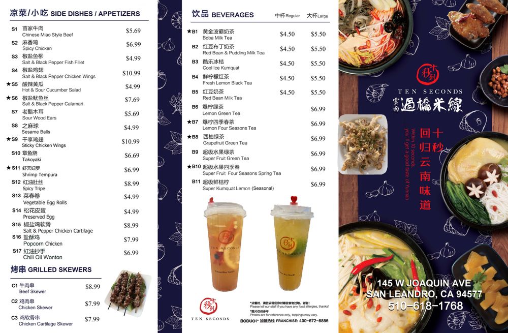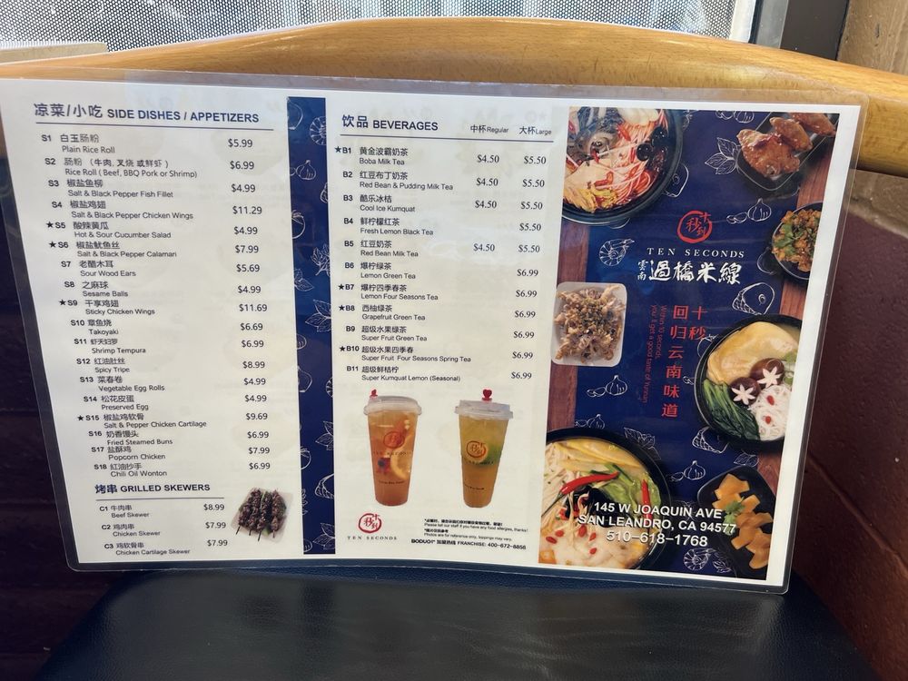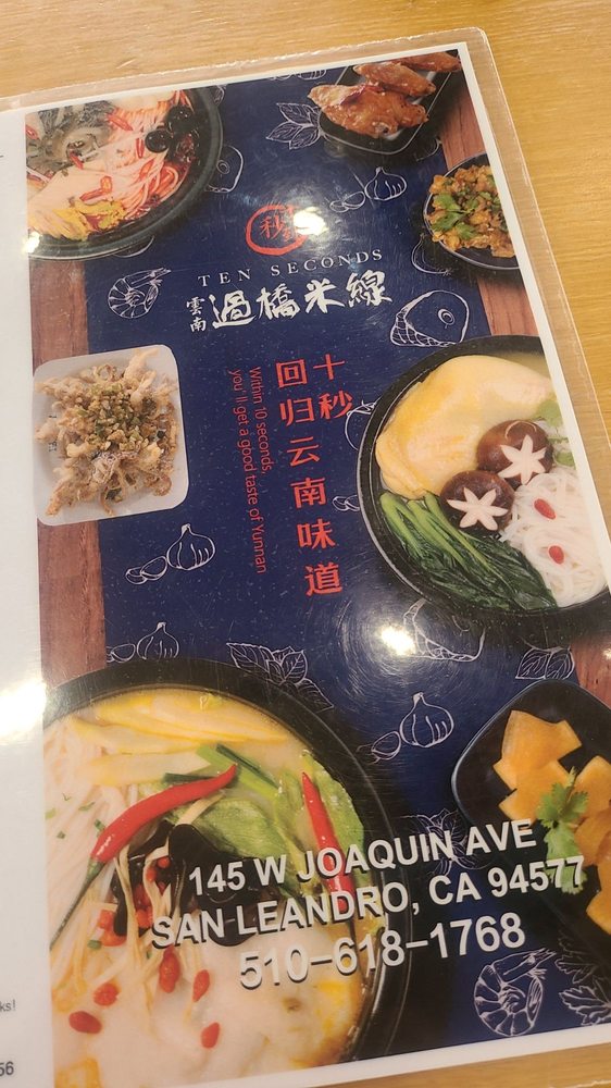 Ten Seconds Yunnan Rice Noodle offers a unique dining experience with its quick and flavorful rice noodle soups. The concept of putting ingredients together and enjoying the noodles for exactly ten seconds adds a fun twist to the meal. Customers appreciate the helpful instructions and the efficiency of the service. Reviews highlight the delicious beef and seafood options, as well as the hearty and flavorful broths. The atmosphere is described as classy with moderate noise levels, making it suitable for groups and kids. The menu also includes bubble tea and a variety of soups to cater to different preferences. Overall, Ten Seconds Yunnan Rice Noodle is a must-try for those looking for a tasty and interactive dining experience in San Leandro, California.
